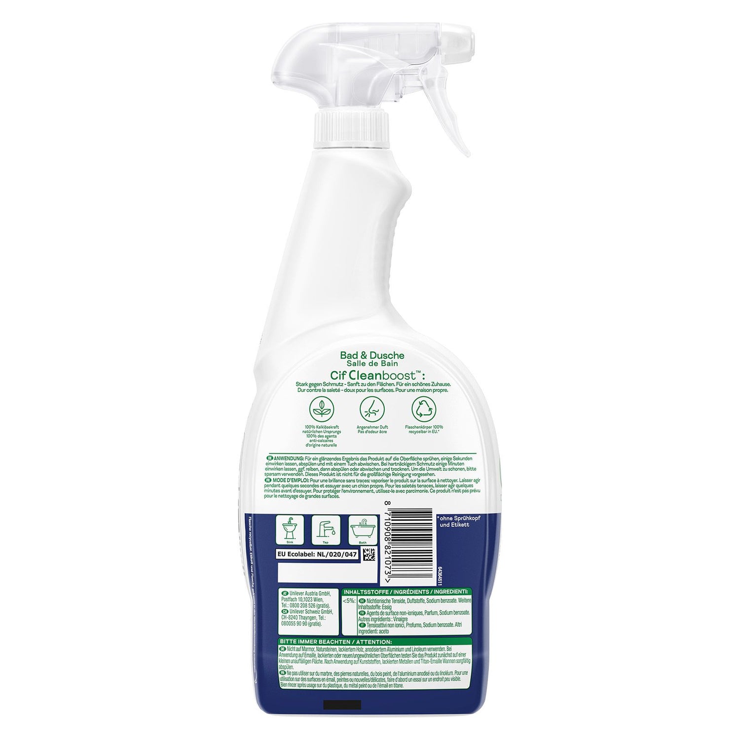 - Die wasserabweisende Technologie des Reinigungssprays für Bad & Dusche beugt der Bildung von Kalk- und Schmutzflecken vor.