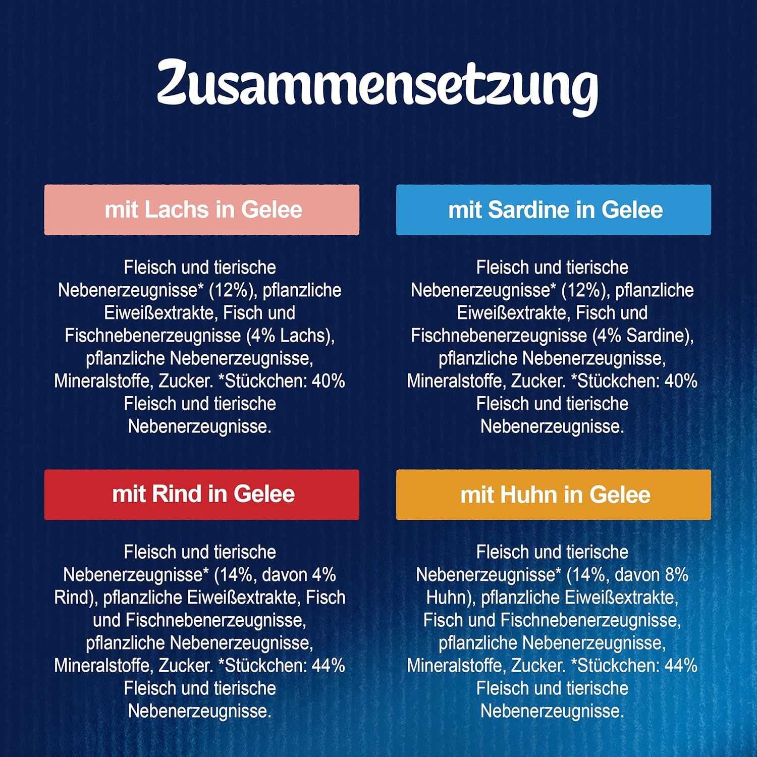 Bei Huhn in Gelee: Fleisch und tierische Nebenerzeugnisse* (14%, davon 8% Huhn), pflanzliche Eiweißextrakte, Fisch und Fischnebenerzeugnisse, Mineralstoffe, Pflanzliche Nebenerzeugnisse, Zucker. Bei Rind in Gelee: Fleisch und tierische Nebenerzeugnisse* (14%, davon 4% Rind), pflanzliche Eiweißextrakte, Fisch und Fischnebenerzeugnisse, Mineralstoffe, Pflanzliche Nebenerzeugnisse, Zucker. Bei Sardine in Gelee: Fleisch und tierische Nebenerzeugnisse* (12%), pflanzliche Eiweißextrakte, Fisch und Fischnebenerzeugnisse (Sardine 4%), Mineralstoffe, Pflanzliche Nebenerzeugnisse, Zucker. Bei Lachs in Gelee: Fleisch und tierische Nebenerzeugnisse* (12%), pflanzliche Eiweißextrakte, Fisch und Fischnebenerzeugnisse (Lachs 4%), Mineralstoffe, Pflanzliche Nebenerzeugnisse, Zucker. *Stückchen: 40% Fleisch und tierische Nebenerzeugnisse.