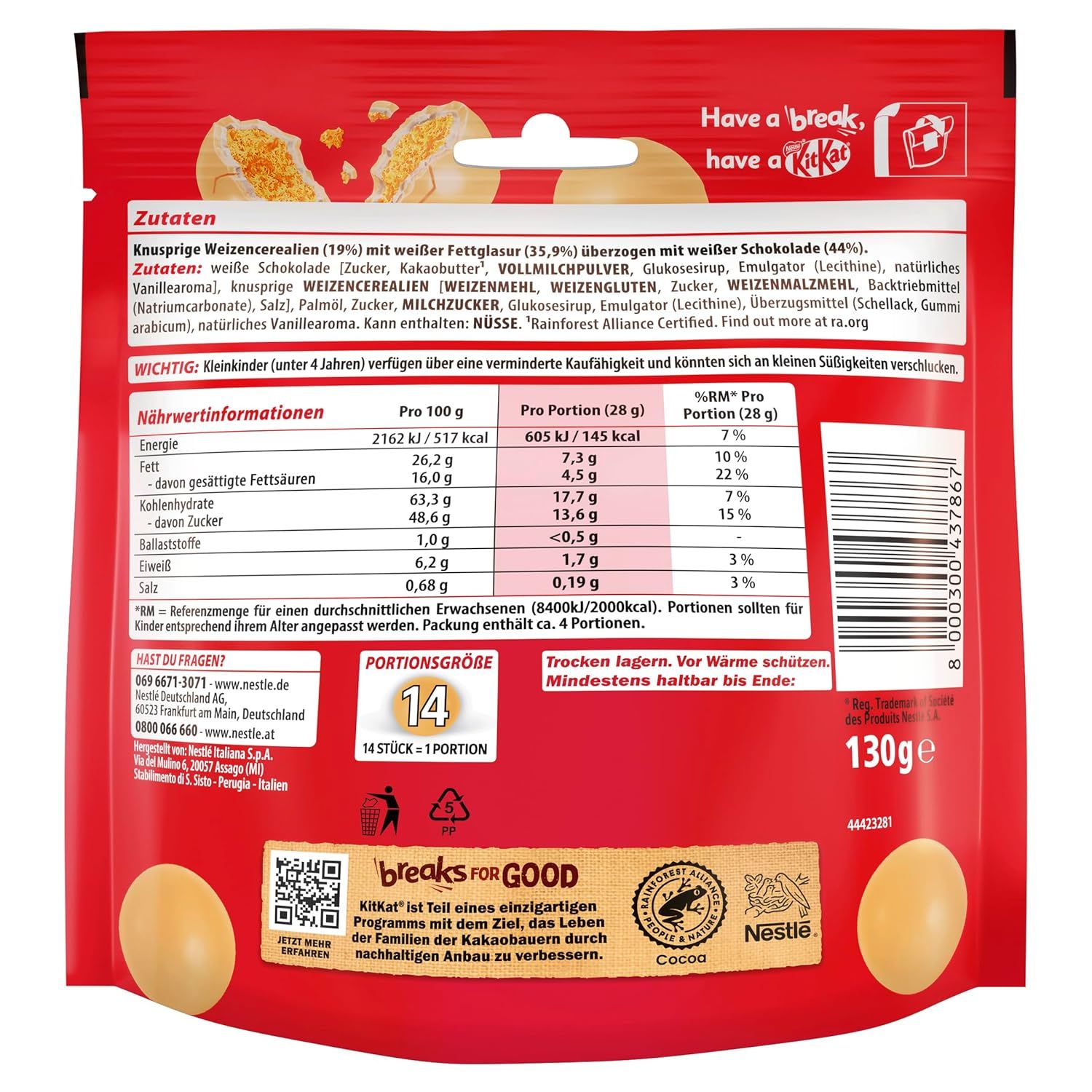 Zutaten: weiße Schokolade [Zucker, Kakaobutter¹, VOLLMILCHPULVER, Glukosesirup, Emulgator (Lecithine), natürliches Vanillearoma], knusprige WEIZENCEREALIEN [WEIZENMEHL, WEIZENGLUTEN, Zucker, WEIZENMALZMEHL, Backtriebmittel (Natriumcarbonate), Salz], Palmöl, Zucker, MILCHZUCKER, Glukosesirup, Emulgator (Lecithine), Überzugsmittel (Schellack, Gummi arabicum), natürliches Vanillearoma. Kann enthalten: NÜSSE. Rainforest Alliance Certified. Find out more at ra.org.