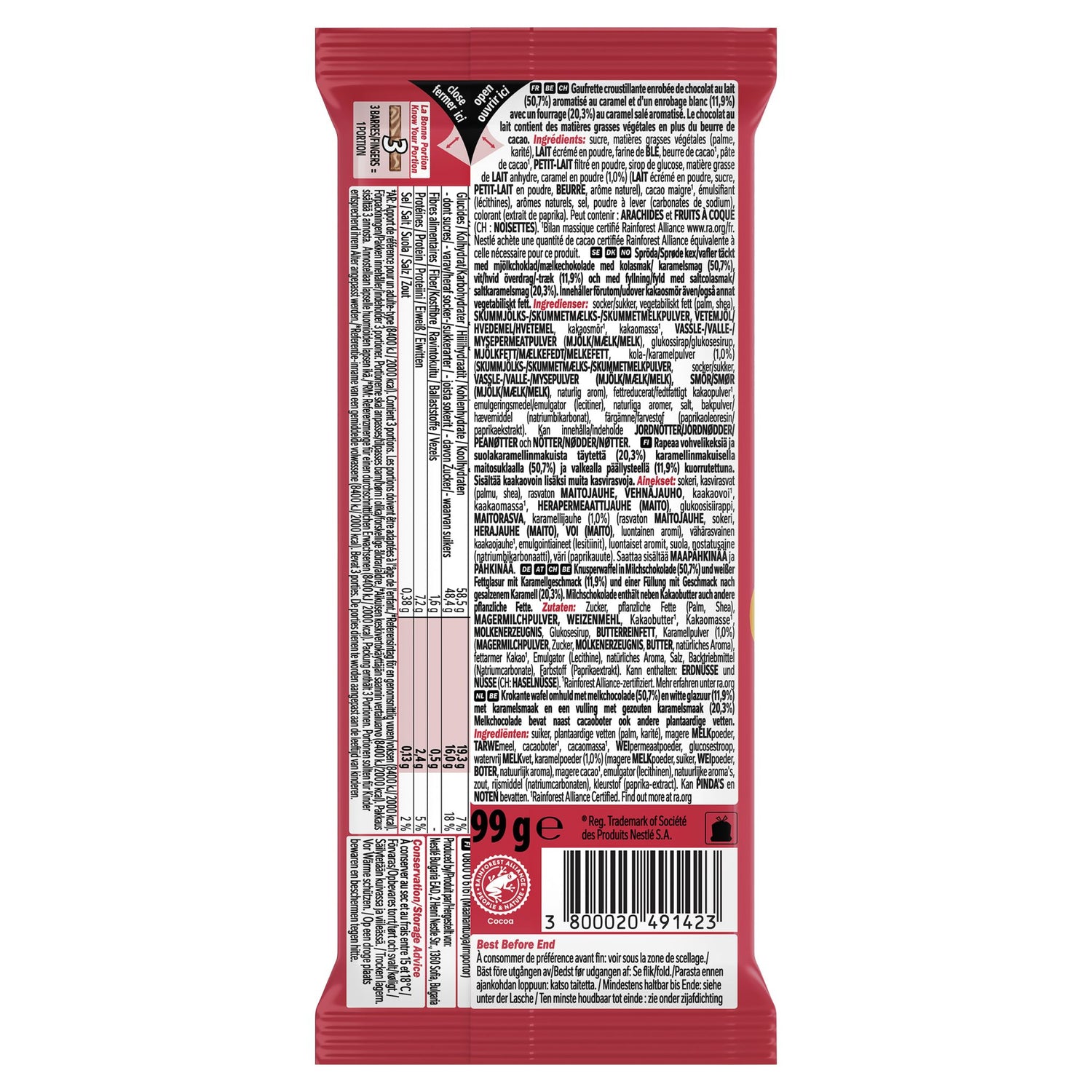 Zucker, pflanzliche Fette (Palm, Shea), MAGERMILCHPULVER, WEIZENMEHL, Kakaobutter¹, Kakaomasse¹, MOLKENERZEUGNIS, Glukosesirup, BUTTERREINFETT, Karamellpulver (1,0%) (MAGERMILCHPULVER, Zucker, MOLKENERZEUGNIS, BUTTER, natürliches Aroma), fettarmer Kakao¹, Emulgator (Lecithine), natürliches Aroma, Salz, Backtriebmittel (Natriumcarbonate), Farbstoff (Paprikaextrakt). Kann enthalten: ERDNÜSSE und NÜSSE. ¹Rainforest Alliance-zertifiziert. Mehr erfahren unter ra.org