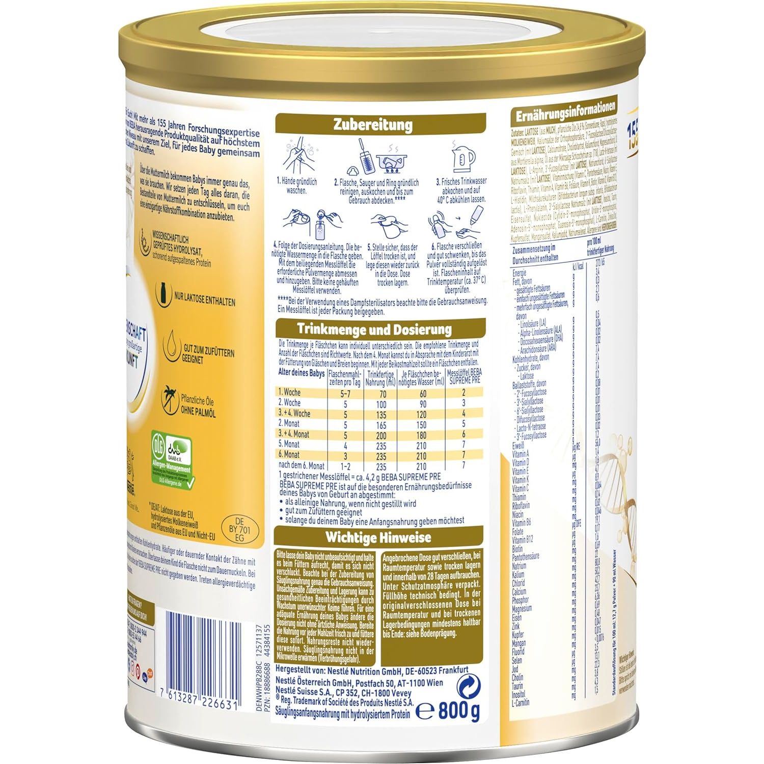 WICHTIGER HINWEIS: Stillen ist die beste Ernährung für dein Baby, daher sollte so lange wie möglich gestillt werden. Bitte sprich mit deinem Kinderarzt oder deiner Hebamme, wenn du eine Säuglingsanfangsnahrung verwenden möchtest. WICHTIGER HINWEIS: Säuglingsanfangsnahrungen enthalten Kohlenhydrate. Häufiger oder dauernder Kontakt der Zähne mit kohlenhydrathaltigen Nahrungen kann Zahnzerstörungen durch Karies verursachen. Überlasse deinem Kind die Flasche nicht zum Dauernuckeln. Bei einer bestehenden Kuhmilchallergie oder dem Verdacht auf eine solche darf BEBA SUPREME PRE nicht gegeben werden. Treten allergieverdächtige Symptome bei deinem Baby auf, solltest du deinen Kinderarzt hinzuziehen.